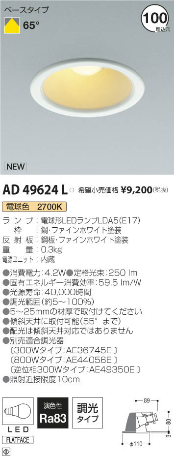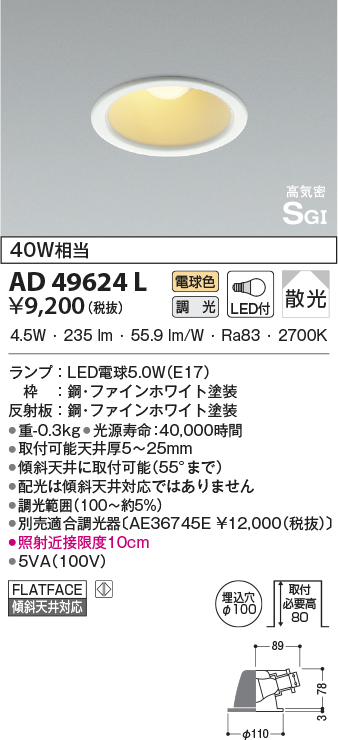| 補足・注意事項 | ◆消費電力:4.5W ◆色温度:2700K ◆演色性:Ra83 ◆光源寿命:40,000時間 ◆取付可能天井厚5~25mm ◆傾斜天井に取付可能(55°まで) ◆配光は傾斜天井対応ではありません ◆調光範囲(100~約5%) ◆別売適合調光器〔AE36745E \12,000(税抜)〕 ◆照射近接限度10cm |