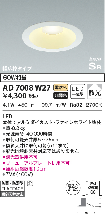 | 補足・注意事項 | ◆消費電力:4.1W ◆色温度:2700K ◆演色性:Ra82 ◆光源寿命:40,000時間 ◆取付可能天井厚5~25mm ◆傾斜天井に取付可能(55°まで) ◆配光は傾斜天井対応ではありません ◆調光器併用不可 ◆リニューアルプレート併用不可 ◆照射近接限度10cm |