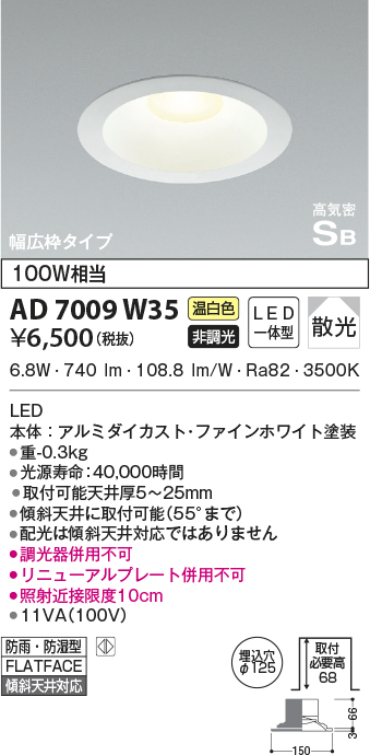 | 補足・注意事項 | ◆消費電力:6.8W ◆色温度:3500K ◆演色性:Ra82 ◆光源寿命:40,000時間 ◆取付可能天井厚5~25mm ◆傾斜天井に取付可能(55°まで) ◆配光は傾斜天井対応ではありません ◆調光器併用不可 ◆リニューアルプレート併用不可 ◆照射近接限度10cm |