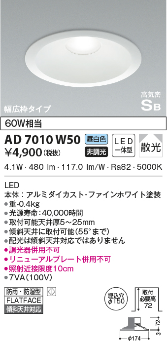 補足・注意事項 | ◆消費電力:4.1W ◆色温度:5000K ◆演色性:Ra82 ◆光源寿命:40,000時間 ◆取付可能天井厚5~25mm ◆傾斜天井に取付可能(55°まで) ◆配光は傾斜天井対応ではありません ◆調光器併用不可 ◆リニューアルプレート併用不可 ◆照射近接限度10cm |