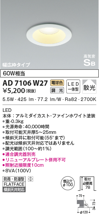 | 補足・注意事項 | ◆消費電力:5.5W ◆色温度:2700K ◆演色性:Ra82 ◆光源寿命:40,000時間 ◆取付可能天井厚5~25mm ◆傾斜天井に取付可能(55°まで) ◆配光は傾斜天井対応ではありません ◆調光範囲(100~約1%) ◆適合調光器別売 ◆リニューアルプレート併用不可 ◆照射近接限度10cm |