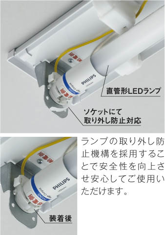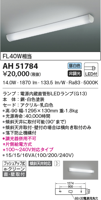 | 補足・注意事項 | ◆消費電力:14.0W ◆色温度:5000K ◆演色性:Ra83 ◆光源寿命:40,000時間 ◆傾斜天井に取付可能(90°まで) ◆傾斜天井取付・壁付の場合は横向き取付のみ ◆落下防止機構付 ◆調光器併用不可 ※100~240V対応タイプ ※片側給電方式 |