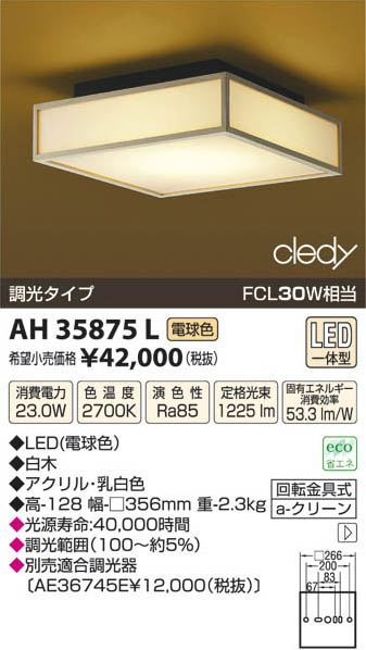 | 補足・注意事項 | ◆消費電力:23.0W ◆色温度:2700K ◆演色性:Ra85 ◆光源寿命:40,000時間 ◆調光範囲(100~約5%) ◆別売適合調光器〔AE36745E \12,000(税抜)〕 ※FCL30W相当 |