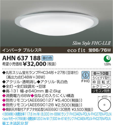 | 補足・注意事項 | ◆消費電力:68.0W ◆虫などの入りにくい構造 ◆別売リモコン〔AEE690127 \5,670(税込)〕 ◆別売リモコン〔AEE690128 \2,625(税込)〕 ◆傾斜天井取付アダプタ対応型〔AEE690130別売 \3,675(税込)〕 |
