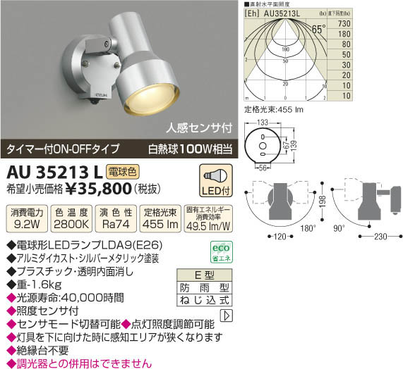 | 補足・注意事項 | ◆消費電力:9.2W ◆色温度:2800K ◆演色性:Ra74 ◆光源寿命:40,000時間 ◆照度センサ付 ◆センサモード切替可能 ◆点灯照度調節可能 ◆調光器との併用はできません ◆白熱球100W相当の明るさ ◆灯具を下に向けた時に感知エリアが狭くなります ◆絶縁台不要 |