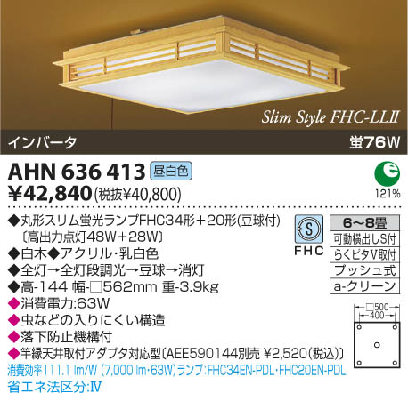 | 補足・注意事項 | ◆消費電力:63.0W ◆虫などの入りにくい構造 ◆落下防止機構付 ◆竿縁天井取付アダプタ対応型〔AEE590144別売 \2,520(税込)〕 |