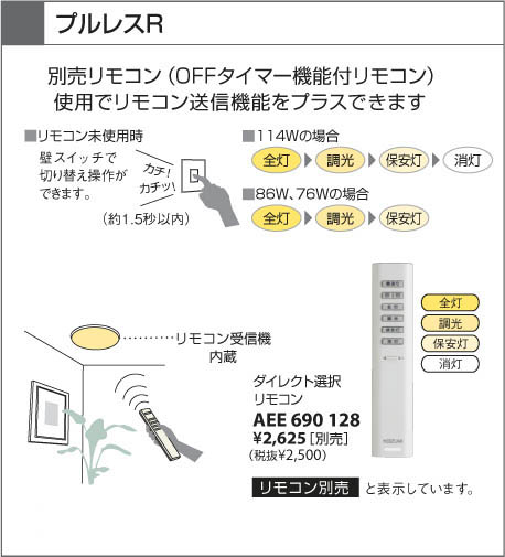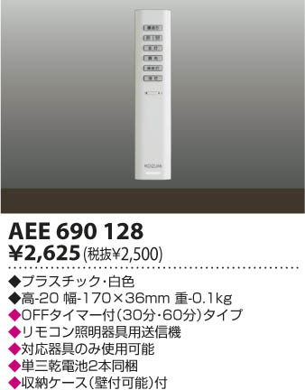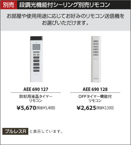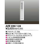 | 補足・注意事項 | ◆消費電力:54.0W ◆虫などの入りにくい構造 ◆別売リモコン〔AEE690127 \5,670(税込)〕 ◆別売リモコン〔AEE690128 \2,625(税込)〕 ◆竿縁天井取付アダプタ対応型〔AEE590144別売 \2,520(税込)〕 ◆傾斜天井取付アダプタ対応型〔AEE690130別売 \3,675(税込)〕 |