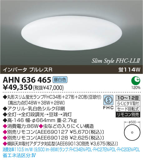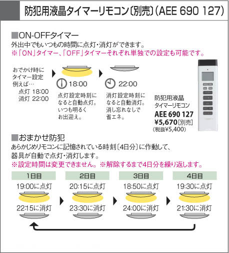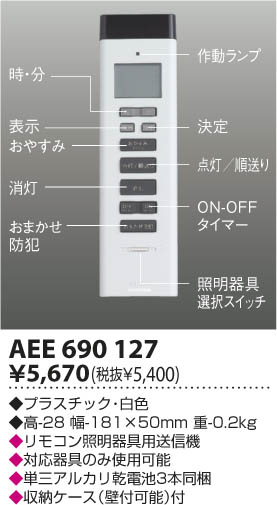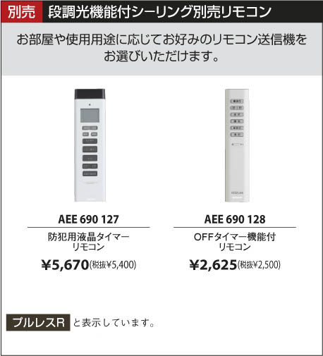 | 補足・注意事項 | ◆消費電力:86.0W ◆虫などの入りにくい構造 ◆別売リモコン〔AEE690127 \5,670(税込)〕 ◆別売リモコン〔AEE690128 \2,625(税込)〕 ◆傾斜天井取付アダプタ対応型〔AEE690130別売 \3,675(税込)〕 |