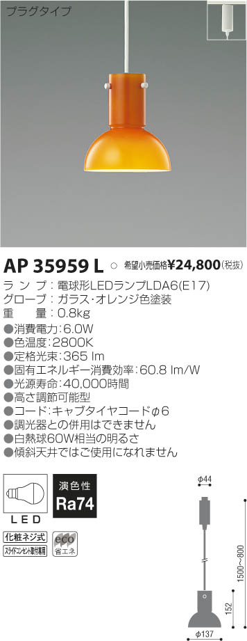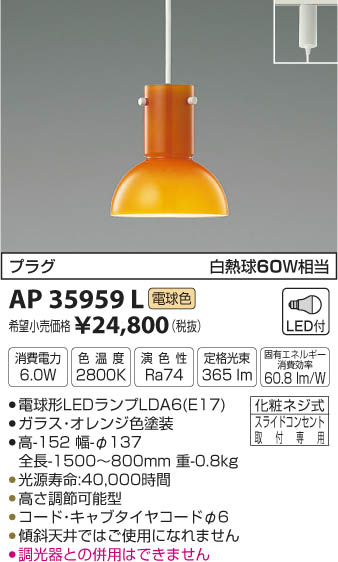 補足・注意事項 | ◆消費電力:6W ◆色温度:2800K ◆演色性:Ra74 ◆傾斜天井ではご使用になれません ◆光源寿命:40,000時間 ◆高さ調節可能型 ◆コード:キャブタイヤコードφ6 ◆調光器との併用はできません ◆白熱球60W相当の明るさ ※白熱球60W相当 |