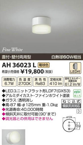 | 補足・注意事項 | ◆消費電力:6.7W ◆色温度:2700K ◆演色性:Ra83 ◆光源寿命:40,000時間 ◆傾斜天井に取付可能(90°まで) ◆調光器との併用はできません ※白熱球60W相当 |