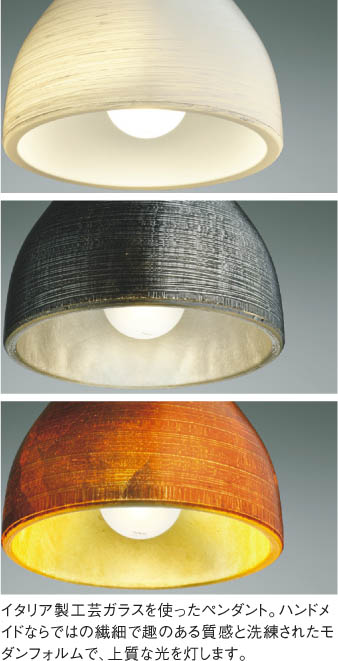 | 補足・注意事項 | ◆消費電力:4.2W ◆光束値:395lm ◆7VA(100V) ◆色温度:2700K ◆演色性:Ra84 ◆光源寿命:40,000時間 ◆高さ調節可能型 ◆コード・キャブタイヤコードφ6 ◆ガラスはイタリア製 ◆手作り品のため写真と多少異なることがあります ◆調光器併用不可 ◆傾斜天井使用不可 |