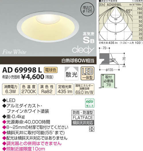 | 補足・注意事項 | ◆消費電力:6.3W ◆色温度:2700K ◆演色性:Ra82 ◆光源寿命:40,000時間 ◆8~25mmの材厚で取付けてください ◆傾斜天井に取付可能(55°まで) ◆配光は傾斜天井対応ではありません ◆調光器との併用はできません ◆照射近接限度10cm ※白熱球60W相当 |