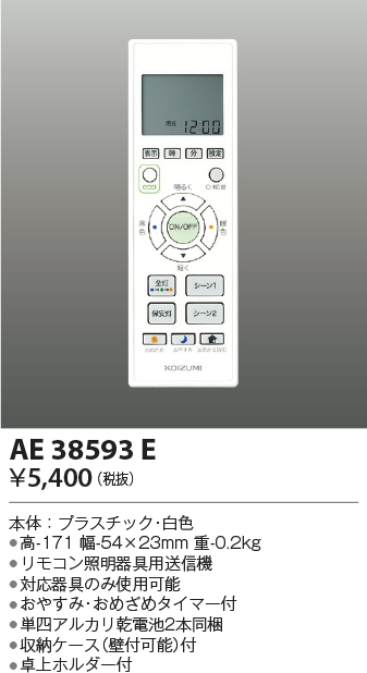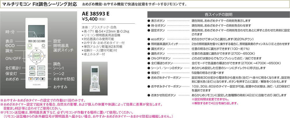 補足・注意事項 | ◆リモコン照明器具用送信機 ◆対応器具のみ使用可能 ◆おやすみ・おめざめタイマー付 ◆単四アルカリ乾電池2本同梱 ◆収納ケース(壁付可能)付 ◆卓上ホルダー付 |