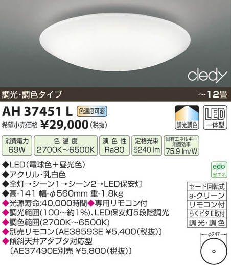 | 補足・注意事項 | ◆消費電力:69.0W ◆色温度:2700K ◆演色性:Ra80 ◆光源寿命:40,000時間 ◆専用リモコン付 ◆調光範囲(100~約1%)、LED保安灯5段階調光 ◆調色範囲(2700K~6500K) ◆AE38593E ◆傾斜天井アダプタ対応型〔AE37490E \(税込)〕 |