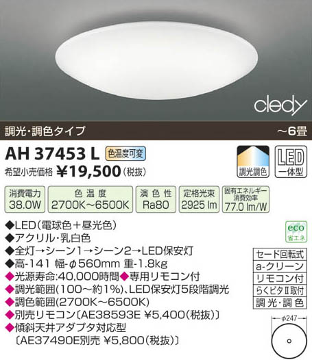 | 補足・注意事項 | ◆消費電力:38.0W ◆色温度:2700K ◆演色性:Ra80 ◆光源寿命:40,000時間 ◆専用リモコン付 ◆調光範囲(100~約1%)、LED保安灯5段階調光 ◆調色範囲(2700K~6500K) ◆AE38593E ◆傾斜天井アダプタ対応型〔AE37490E \(税込)〕 |