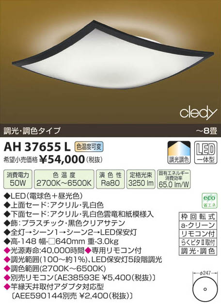 | 補足・注意事項 | ◆消費電力:50.0W ◆色温度:2700K ◆演色性:Ra80 ◆光源寿命:40,000時間 ◆専用リモコン付 ◆調光範囲(100~約1%)、LED保安灯5段階調光 ◆調色範囲(2700K~6500K) ◆AE38593E ◆竿縁天井取付アダプタ対応型〔AEE590144別売 \(税込)〕 |
