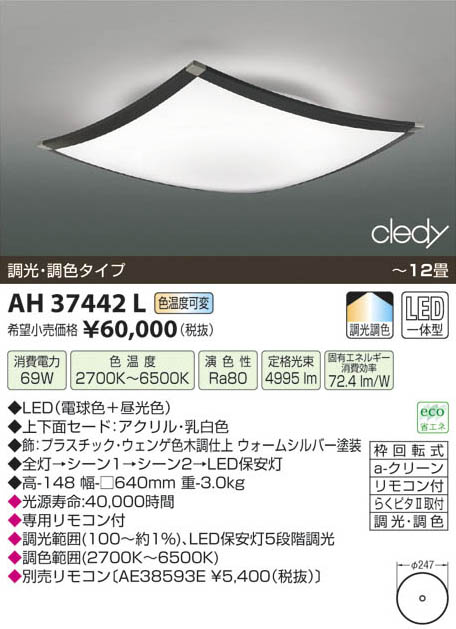 | 補足・注意事項 | ◆消費電力:69.0W ◆色温度:2700K ◆演色性:Ra80 ◆光源寿命:40,000時間 ◆専用リモコン付 ◆調光範囲(100~約1%)、LED保安灯5段階調光 ◆調色範囲(2700K~6500K) ◆AE38593E |