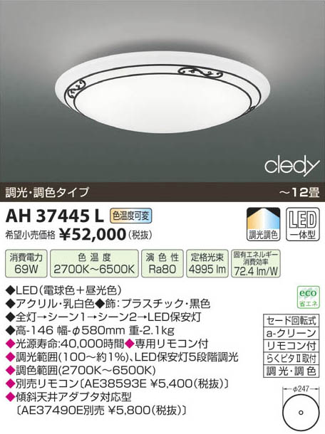 | 補足・注意事項 | ◆消費電力:69.0W ◆色温度:2700K ◆演色性:Ra80 ◆光源寿命:40,000時間 ◆専用リモコン付 ◆調光範囲(100~約1%)、LED保安灯5段階調光 ◆調色範囲(2700K~6500K) ◆AE38593E ◆傾斜天井アダプタ対応型〔AE37490E \(税込)〕 |