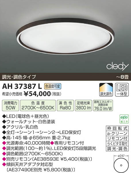 | 補足・注意事項 | ◆消費電力:50.0W ◆色温度:2700K ◆演色性:Ra80 ◆光源寿命:40,000時間 ◆専用リモコン付 ◆調光範囲(100~約1%)、LED保安灯5段階調光 ◆調色範囲(2700K~6500K) ◆AE38593E ◆傾斜天井アダプタ対応型〔AE37490E \(税込)〕 |