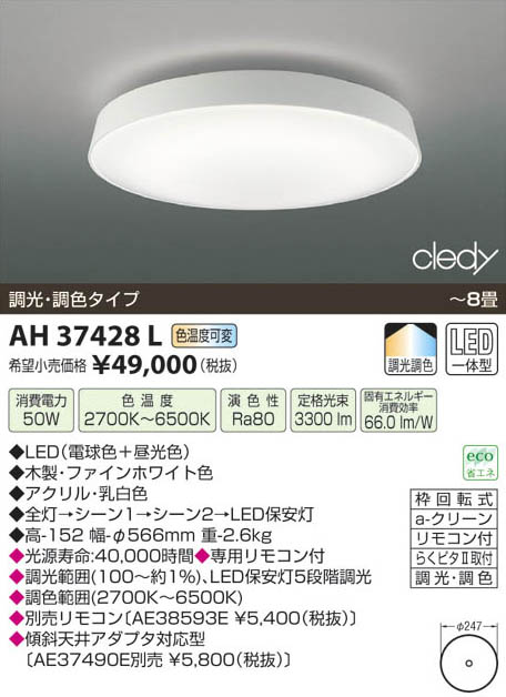 | 補足・注意事項 | ◆消費電力:50.0W ◆色温度:2700K ◆演色性:Ra80 ◆光源寿命:40,000時間 ◆専用リモコン付 ◆調光範囲(100~約1%)、LED保安灯5段階調光 ◆調色範囲(2700K~6500K) ◆AE38593E ◆傾斜天井アダプタ対応型〔AE37490E \(税込)〕 |