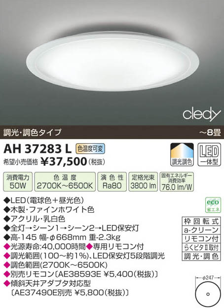 | 補足・注意事項 | ◆消費電力:50.0W ◆色温度:2700K ◆演色性:Ra80 ◆光源寿命:40,000時間 ◆専用リモコン付 ◆調光範囲(100~約1%)、LED保安灯5段階調光 ◆調色範囲(2700K~6500K) ◆AE38593E ◆傾斜天井アダプタ対応型〔AE37490E \(税込)〕 |