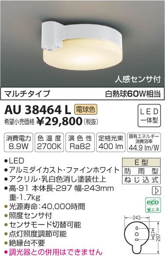 | 補足・注意事項 | ◆消費電力:8.9W ◆色温度:2700K ◆演色性:Ra82 ◆光源寿命:40,000時間 ◆照度センサ付 ◆センサモード切替可能 ◆点灯照度調節可能 ◆絶縁台不要 ◆調光器との併用はできません ※色温度:2700K ※白熱球60W相当 |