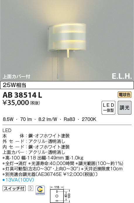 | 補足・注意事項 | ◆消費電力:8.5W ◆光束値:70lm ◆13VA(100V) ◆色温度:2700K ◆演色性:Ra83 ◆光源寿命:40,000時間 ◆調光範囲(100~約1%) ◆灯具可動型(左右0~30°・上向0~30°) ◆天井近接限度10cm ◆別売適合調光器〔AE36745E \12,000(税抜)〕 |