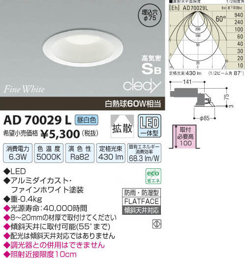 | 補足・注意事項 | ◆消費電力:6.3W ◆色温度:5000K ◆演色性:Ra82 ◆光源寿命:40,000時間 ◆8~20mmの材厚で取付けてください ◆傾斜天井に取付可能(55°まで) ◆配光は傾斜天井対応ではありません ◆調光器との併用はできません ◆照射近接限度10cm ※白熱球60W相当 |