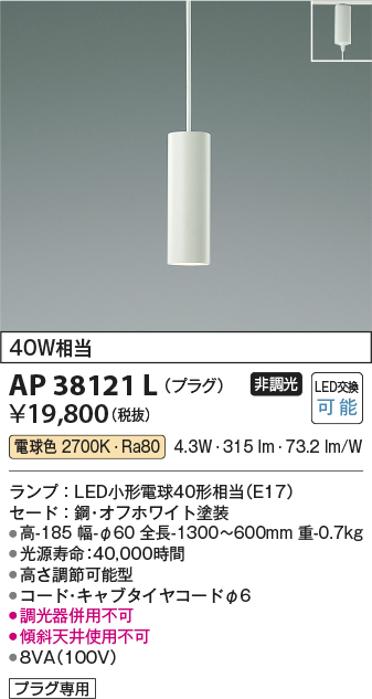 | 補足・注意事項 | ◆消費電力:4.3W ◆光束値:315lm ◆8VA(100V) ◆色温度:2700K ◆演色性:Ra80 ◆光源寿命:40,000時間 ◆高さ調節可能型 ◆コード・キャブタイヤコードφ6 ◆調光器併用不可 ◆傾斜天井使用不可 |