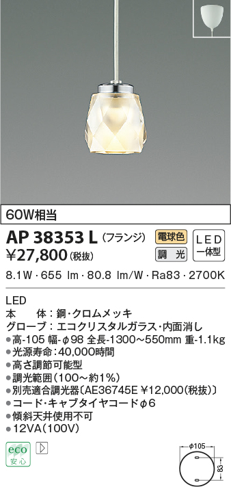 | 補足・注意事項 | ◆消費電力:8.1W ◆色温度:2700K ◆演色性:Ra83 ◆光源寿命:40,000時間 ◆高さ調節可能型 ◆調光範囲(100~約1%) ◆別売適合調光器〔AE36745E \12,000(税抜)〕 ◆コード・キャブタイヤコードφ6 ◆傾斜天井使用不可 |