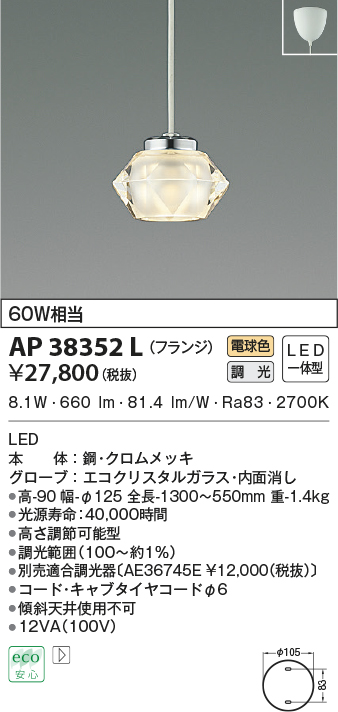 | 補足・注意事項 | ◆消費電力:8.1W ◆色温度:2700K ◆演色性:Ra83 ◆光源寿命:40,000時間 ◆高さ調節可能型 ◆調光範囲(100~約1%) ◆別売適合調光器〔AE36745E \12,000(税抜)〕 ◆コード・キャブタイヤコードφ6 ◆傾斜天井使用不可 |