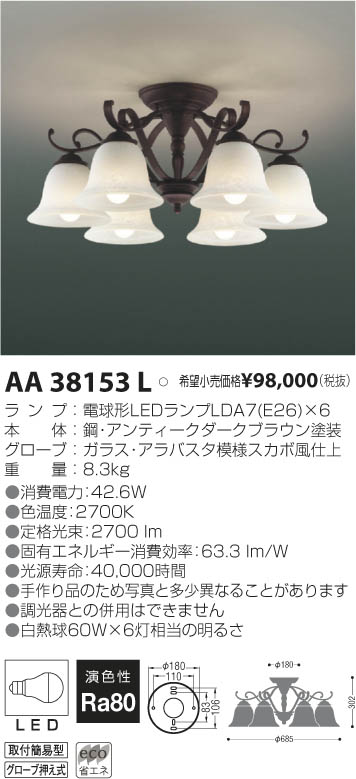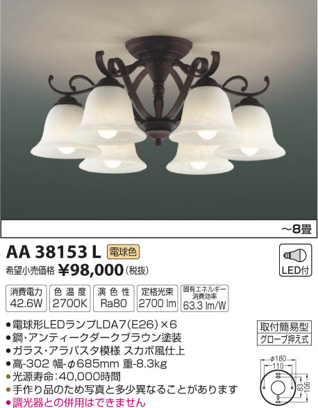 | 補足・注意事項 | ◆消費電力:42.6W ◆色温度:2700K ◆演色性:Ra80 ◆光源寿命:40,000時間 ◆手作り品のため写真と多少異なることがあります ◆調光器との併用はできません ◆白熱球60W×6灯相当の明るさ |