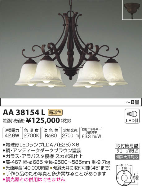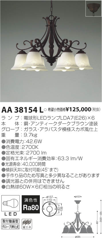 | 補足・注意事項 | ◆消費電力:42.6W ◆色温度:2700K ◆演色性:Ra80 ◆光源寿命:40,000時間 ◆傾斜天井に取付可能(45°まで) ◆手作り品のため写真と多少異なることがあります ◆調光器との併用はできません ◆白熱球60W×6灯相当の明るさ |