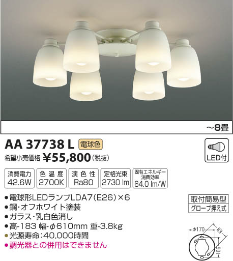 | 補足・注意事項 | ◆消費電力:42.6W ◆色温度:2700K ◆演色性:Ra80 ◆光源寿命:40,000時間 ◆調光器との併用はできません ※色温度:2700K |
