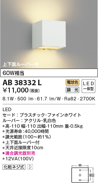 | 補足・注意事項 | ◆消費電力:8.1W ◆光束値:500lm ◆12VA(100V) ◆色温度:2700K ◆演色性:Ra82 ◆光源寿命:40,000時間 ◆調光範囲(100~約1%) ◆上下面ルーバー付 ◆適合調光器別売 ◆天井近接限度10cm |