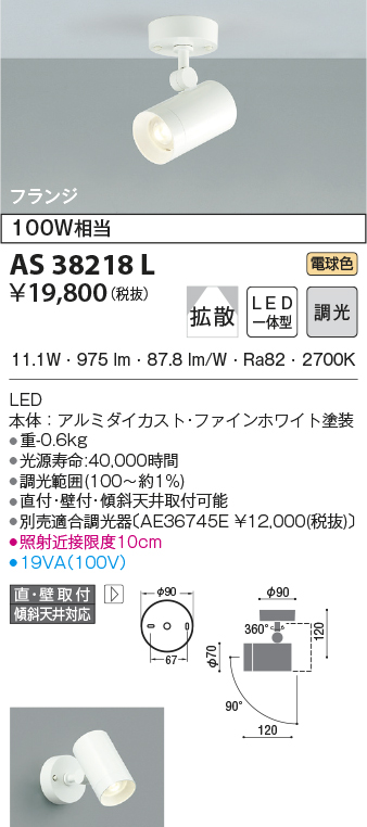 | 補足・注意事項 | ◆消費電力:11.1W ◆光束値:975lm ◆19VA(100V) ◆色温度:2700K ◆演色性:Ra82 ◆光源寿命:40,000時間 ◆調光範囲(100~約1%) ◆直付・壁付・傾斜天井取付可能 ◆別売適合調光器〔AE36745E \12,000(税抜)〕 ◆照射近接限度10cm |