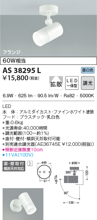 | 補足・注意事項 | ◆消費電力:6.9W ◆色温度:5000K ◆演色性:Ra82 ◆光源寿命:40,000時間 ◆調光範囲(100~約1%) ◆直付・壁付・傾斜天井取付可能 ◆別売適合調光器〔AE36745E \12,000(税抜)〕 ◆照射近接限度10cm |