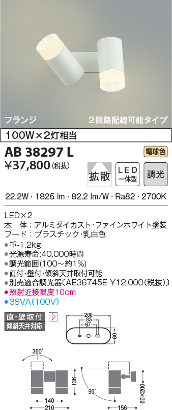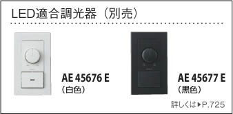 | 補足・注意事項 | ◆消費電力:22.2W ◆光束値:1825lm ◆38VA(100V) ◆色温度:2700K ◆演色性:Ra82 ◆光源寿命:40,000時間 ◆調光範囲(100~約1%) ◆直付・壁付・傾斜天井取付可能 ◆別売適合調光器〔AE36745E \12,000(税抜)〕 ◆照射近接限度10cm |