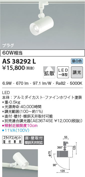 | 補足・注意事項 | ◆消費電力:6.9W ◆光束値:670lm ◆11VA(100V) ◆色温度:5000K ◆演色性:Ra82 ◆光源寿命:40,000時間 ◆調光範囲(100~約1%) ◆直付・壁付・傾斜天井取付可能 ◆別売適合調光器〔AE36745E \12,000(税抜)〕 ◆照射近接限度10cm |