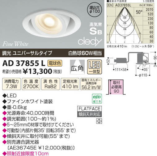 | 補足・注意事項 | ◆消費電力:7.3W ◆色温度:2700K ◆演色性:Ra82 ◆光源寿命:40,000時間 ◆調光範囲(100~約1%) ◆5~25mmの材厚で取付けてください ◆可動型(内部片側35°回転355°まで) ◆傾斜天井に取付可能(55°まで) ◆別売適合調光器〔AE36745E \12,000(税抜)〕 ◆照射近接限度10cm ※白熱球60W相当 |