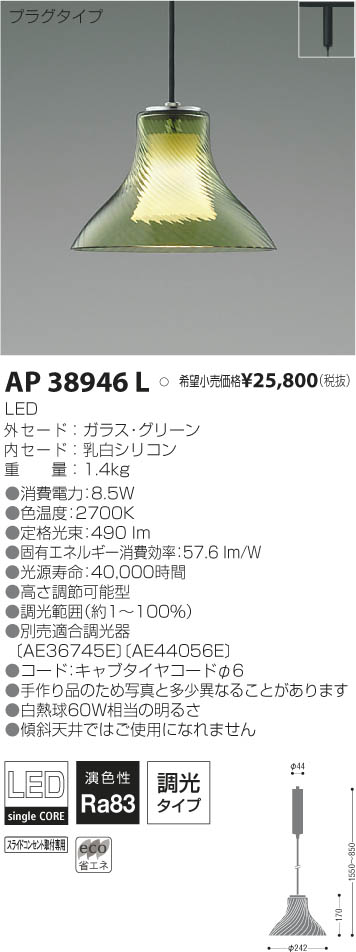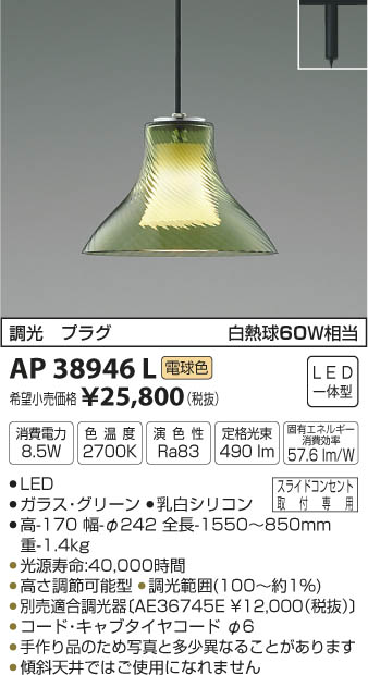 補足・注意事項 | ◆消費電力:8.5W ◆色温度:2700K ◆演色性:Ra83 ◆傾斜天井ではご使用になれません ◆光源寿命:40,000時間 ◆高さ調節可能型 ◆調光範囲(約1~100%) ◆別売適合調光器〔AE36745E \12,000(税抜)〕〔AE44056E \15,800(税抜)〕 ◆コード:キャブタイヤコードφ6 ◆手作り品のため写真と多少異なることがあります ◆白熱球60W相当の明るさ ※白熱球60W相当 |