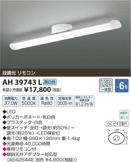 | 補足・注意事項 | ◆消費電力:37.0W ◆色温度:5000K ◆演色性:Ra80 ◆光源寿命:40,000時間 ◆専用リモコン付 ◆傾斜天井アダプター対応型 〔AE42644E 別売 \4,800(税抜)〕 |