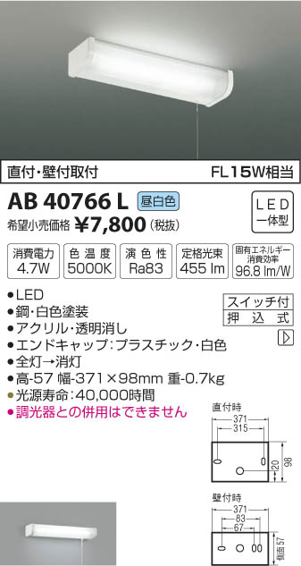 | 補足・注意事項 | ◆消費電力:4.7W ◆色温度:5000K ◆演色性:Ra83 ◆光源寿命:40,000時間 ◆調光器との併用はできません ※色温度:5000K ※FL15W相当 |