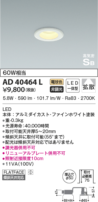 | 補足・注意事項 | ◆消費電力:5.8W ◆色温度:2700K ◆演色性:Ra83 ◆光源寿命:40,000時間 ◆取付可能天井厚5~20mm ◆傾斜天井に取付可能(55°まで) ◆配光は傾斜天井対応ではありません ◆調光器併用不可 ◆リニューアルプレート併用不可 ◆照射近接限度10cm |