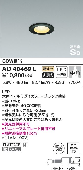 | 補足・注意事項 | ◆消費電力:5.8W ◆色温度:2700K ◆演色性:Ra83 ◆光源寿命:40,000時間 ◆取付可能天井厚5~20mm ◆傾斜天井に取付可能(55°まで) ◆配光は傾斜天井対応ではありません ◆調光器併用不可 ◆リニューアルプレート併用不可 ◆照射近接限度10cm |
