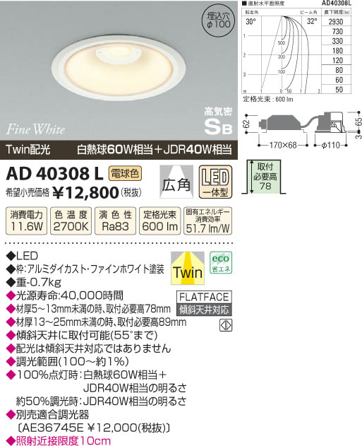 | 補足・注意事項 | ◆消費電力:11.6W ◆色温度:2700K ◆演色性:Ra83 ◆光源寿命:40,000時間 ◆材厚5~13mm未満の時、取付必要高78mm ◆材厚13~25mm未満の時、取付必要高89mm ◆傾斜天井に取付可能(55°まで) ◆配光は傾斜天井対応ではありません ◆調光範囲(100~約1%) ◆100%点灯時: 白熱球60W相当+JDR40W相当の明るさ 約50%調光時:JDR40W相当の明るさ ◆別売適合調光器〔AE36745E \12,000(税抜)〕 ◆別売適合調光器〔AE36745E \12,000(税抜)〕 ◆照射近接限度10cm ※白熱球60W相当+JDR40W相当 |