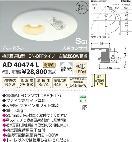 | 補足・注意事項 | ◆消費電力:6.3W ◆色温度:2800K ◆演色性:Ra74 ◆25mm以下の材厚で取付けてください ◆壁スイッチで換気扇連続動作に切替可能 ◆換気扇遅れ停止機能付(消灯の5分後に停止) ◆換気扇負荷用端子台付 ◆接続可能換気扇負荷2~30W ◆トイレ以外では使用しないでください ※白熱球60W相当 |