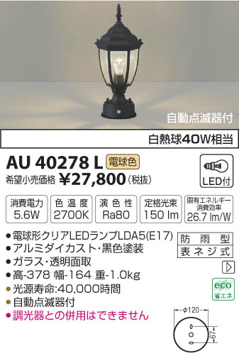 | 補足・注意事項 | ◆消費電力:5.6W ◆色温度:2700K ◆演色性:Ra80 ◆光源寿命:40,000時間 ◆自動点滅器付 ◆調光器との併用はできません ※色温度:2700K ※白熱球40W相当 |