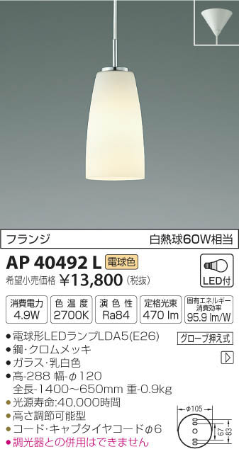 | 補足・注意事項 | ◆消費電力:4.9W ◆色温度:2700K ◆演色性:Ra84 ◆光源寿命:40,000時間 ◆高さ調節可能型 ◆コード・キャブタイヤコード φ6 ◆調光器との併用はできません ※色温度:2700K ※白熱球60W相当 |