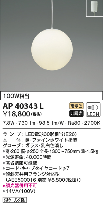 | 補足・注意事項 | ◆消費電力:7.8W ◆色温度:2700K ◆演色性:Ra80 ◆光源寿命:40,000時間 ◆高さ調節可能型 ◆コード・キャブタイヤコードφ7 ◆傾斜天井用フランジ対応型〔AEE590016 別売 \8,800(税抜)〕 ◆調光器併用不可 |